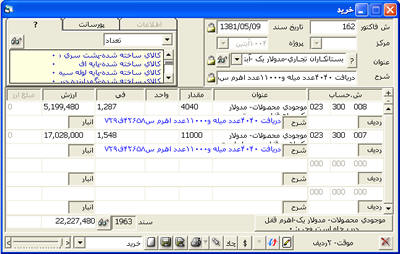 سیستم خریدسيستم خريد اطلاعات اوليه خود، از قبيل حساب اشخاص و حسابهاي موجودي كالا، را از سرفصلهاي حسابداري استخراج ميكند. با ثبت اطلاعات در فرم فاكتور خريد موجودي تعدادي انبار افزايش يافته و سند حسابداری نيز به صورت خودكار صادر میگردد. فرم برگشت از خريد جهت كالاهاي مرجوعي، سهولت در ثبت اطلاعات مالي و قيمت گذاري را به ارمغان ميآورد. ارتباط با فرم اسناد پرداختني در سيستم چك و فرم صندوق، ثبت پرداختهاي نقدي و غير نقدي را بسيار سهل و آسان ميگرداند.